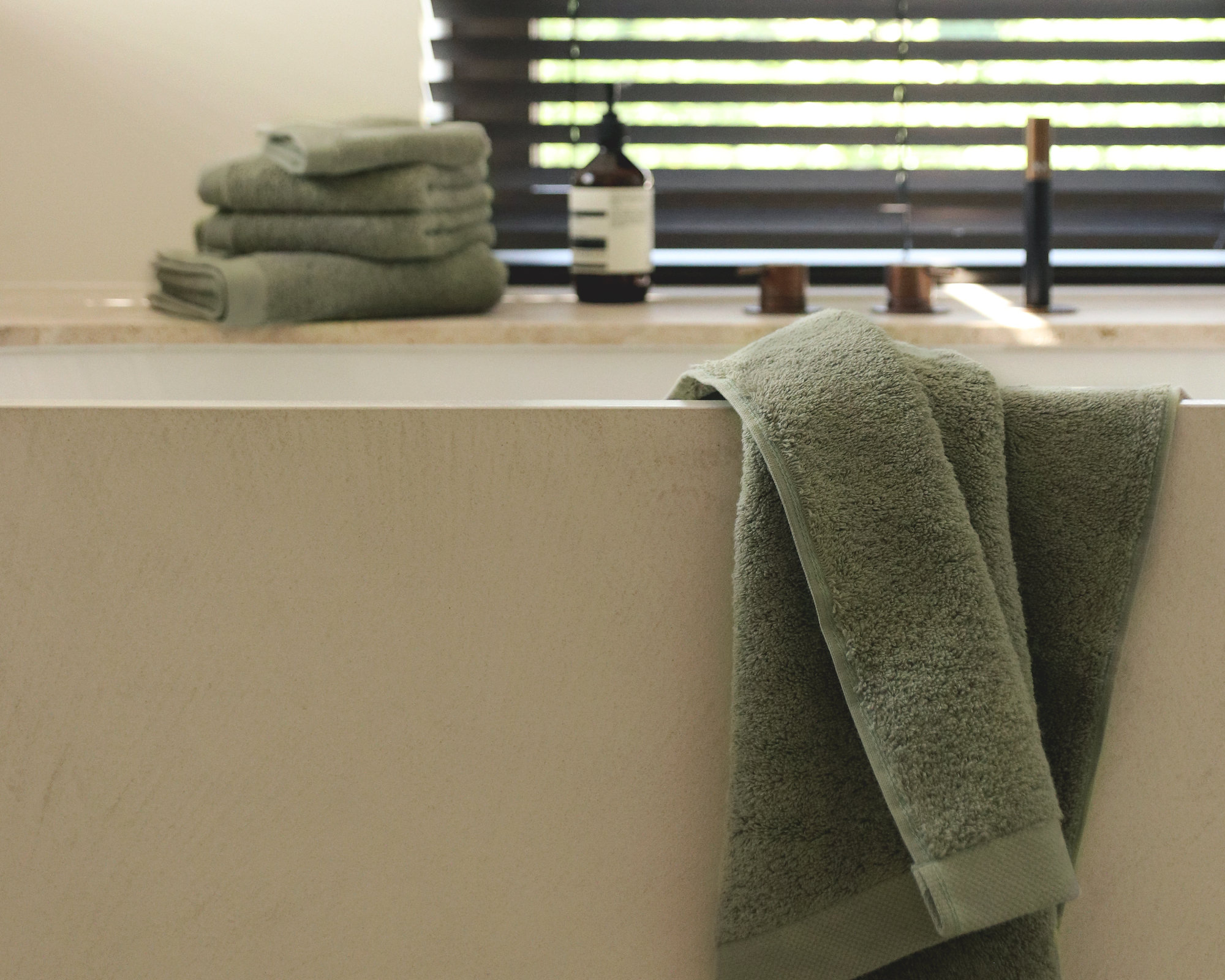 Towels made of 100% combed cotton, 650 gr/m². Finished with a simple, clean edge.