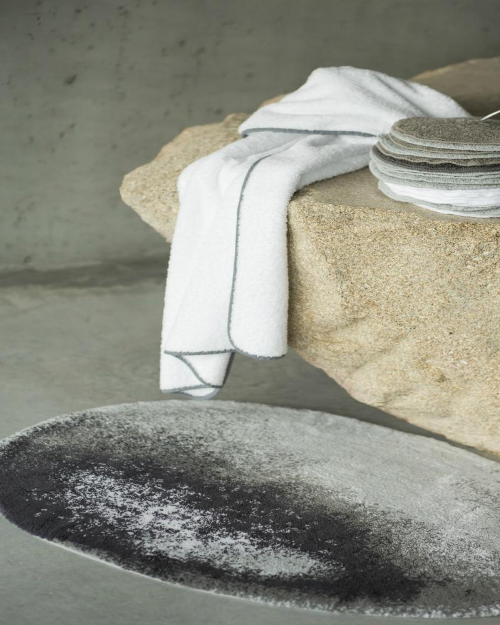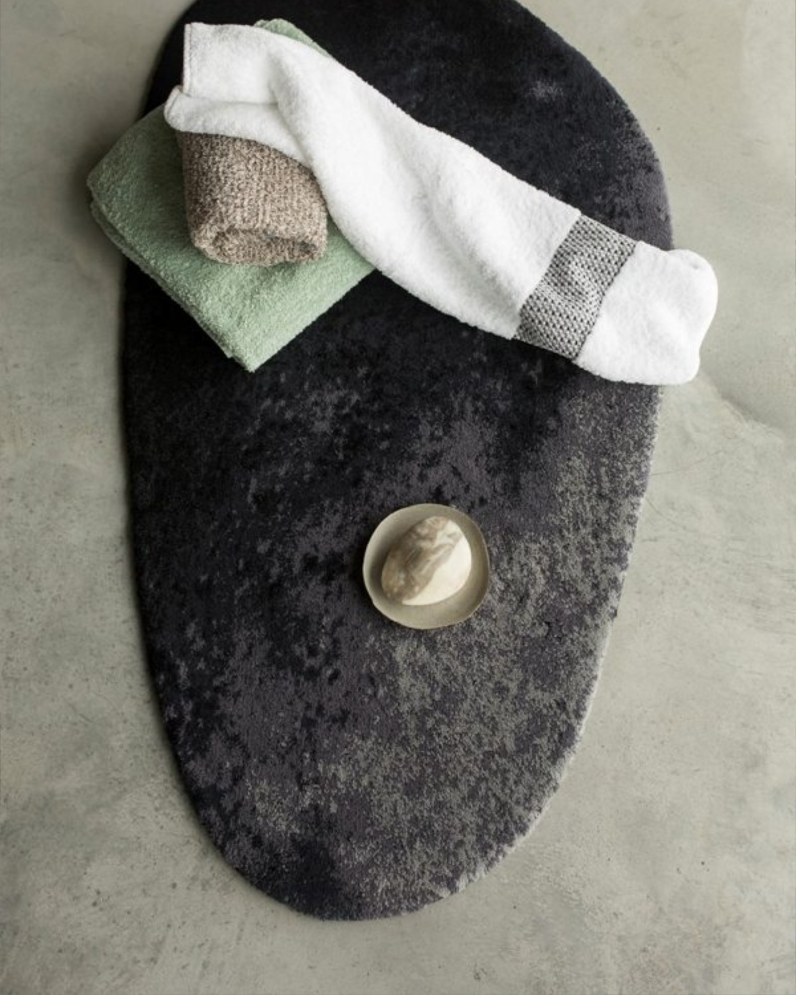 Le tapis de bain Stone d'Abyss & Habidecor est un design unique, il ressemble à une pierre assez réaliste dans des tons noirs et gris élégants.
