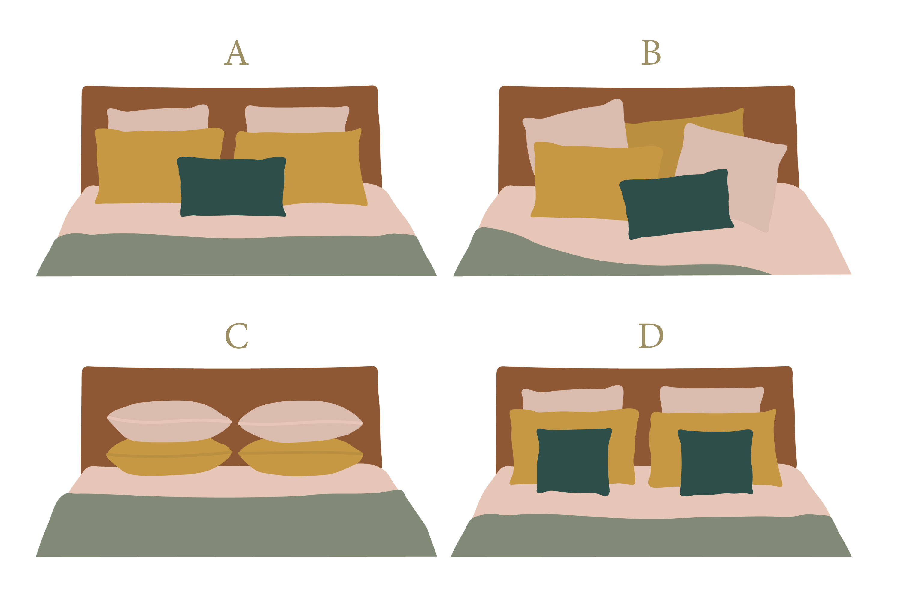 Twee grote hoofdkussens (65x65 cm) achteraan, met twee langwerpige (50x75 cm) ervoor. Eventueel afgewerkt met een langwerpig sierkussen in het midden. Deze stijl straalt orde en rust uit en geeft je bed een subtiel hotelgevoel.